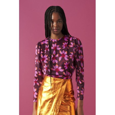 Blusa de cuello redondo y manga larga. Cremallera lateral. Botón con abertura en espalda.