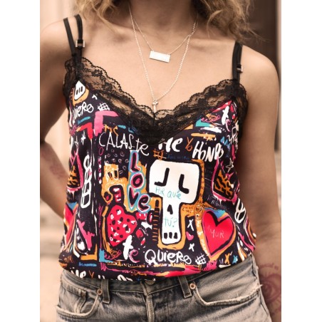 Camiseta de tirante (regulable) con detalle de encaje en pecho y estampado total print Love Pop. Es una camiseta muy especial con mucho rollazo!