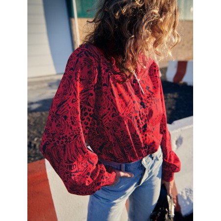 Camisa total print con estampado personalizado de Felinos. Botones negro mate aire retro y mangas abullonadas.