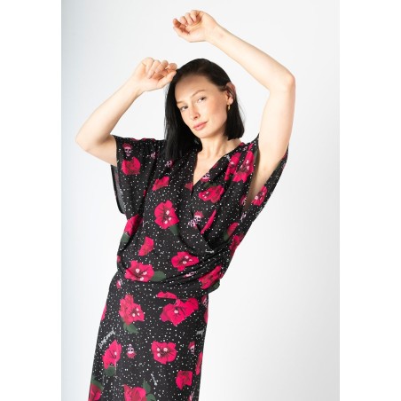 Camiseta de manga corta, de tul sublimado. Con cuello cruzado de pico.