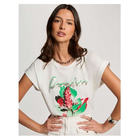 CAMISETA CON MENSAJE, CORTE RECTO, CUELLO REDONDO, MANGA CORTA, ESTAMPADO FLORAL Y MENSAJE PARADISE EN LA PARTE DELANTERA, MANGAS CON DOBLADILLO