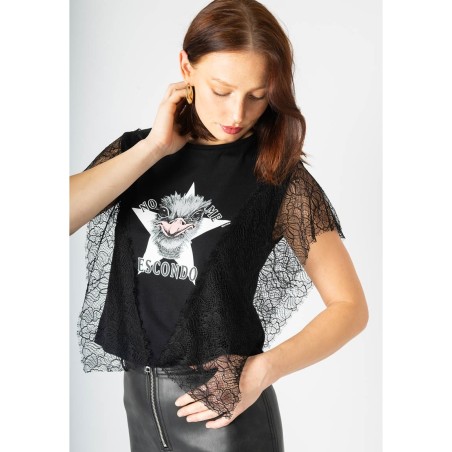 Camiseta negra con mangas formadas por un delicado encaje. Una auténtica obra de artesanía. Lo dice el patrón tan especial y lo dice el la ilustración.