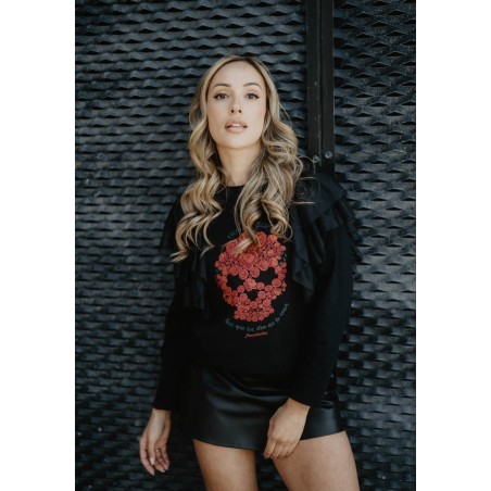 Camiseta de manga larga con volantes de rejilla en los hombros y con el mensaje “Vive y sé feliz, y haz que los demás lo sean”.