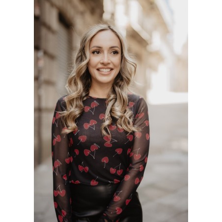 Camiseta de tul con estampado de cerezas y con puntilla en el bajo de las mangas.