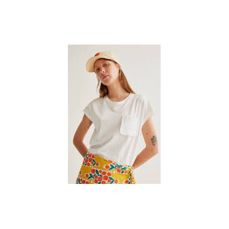 Camiseta con tejido 100% algodón de color blanco. Cuello redondo y manga corta. Detalle de bolsillo con volantes