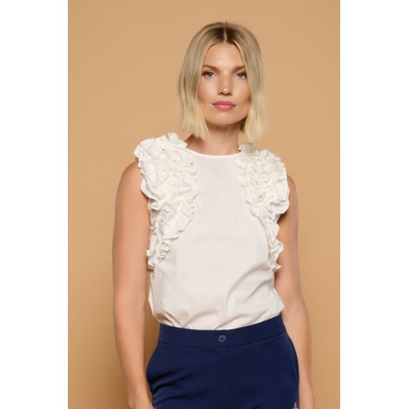 Camiseta de cuello redondo y manga sisa. Cierre con cremallera trasera. Volantes fruncidos en sisas.