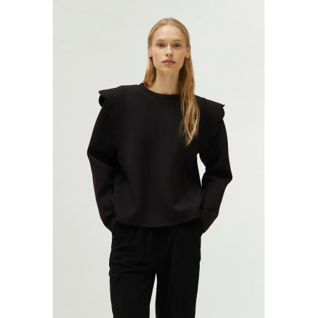 Sudadera de neopreno de color negro. Con cuello redondo y manga larga. Detalle de ondas en los laterales.