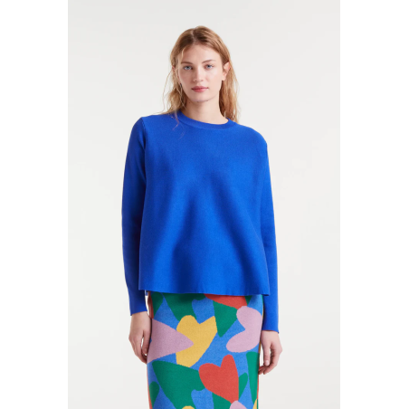 Jersey de punto con corte envasé de color azul. Con cuello redondo y manga larga.