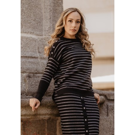 Jersey de rayas asimétrico de punto (es un poco más largo por detrás que por delante), con tira de tachuelas en forma de estrellas decorativas en los hombros, y aberturas laterales. Con un pequeño agujero para meter el dedo pulgar.