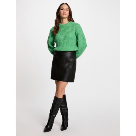 Falda corta cuero sintético Talle estándar Corte acampanado Falda corta Cierre de cremallera en la parte posterior 2 bolsillos traseros con un botón en la parte delantera Cuero sintético