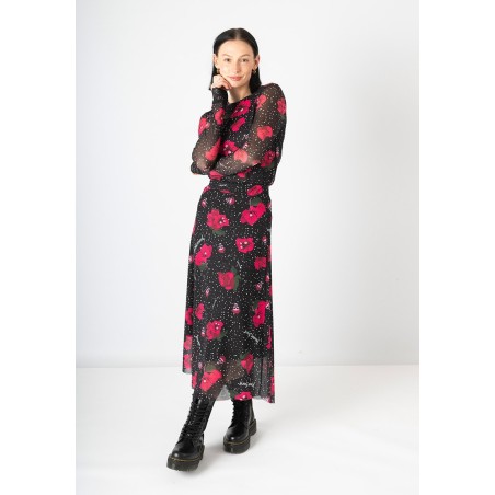 Falda larga de tul sublimado, de tiro alto con goma ajustable en la cintura.