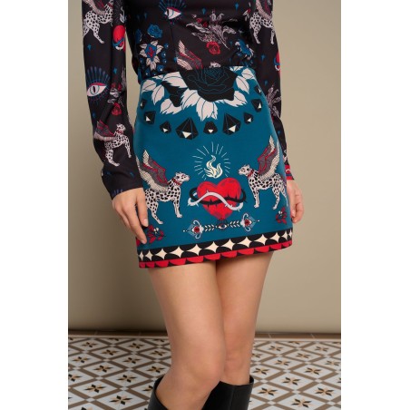 Falda corta de estampado místico con gatos alados y corazones. Forro interior.