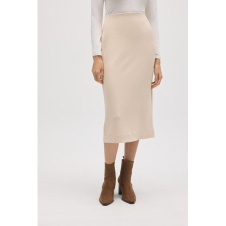 Falda corte midi con largo hasta media pierna, que le da un aire elegante.