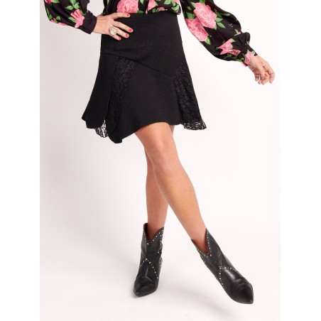 Falda elástica asimétrica con vuelo y encaje de flores.