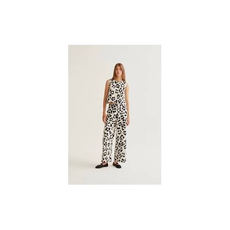 Pantalón de tejido 100% algodón con estampado dalmatian. Cintura fija elástica de tiro medio. Pernera recta. Bolsillos laterales.