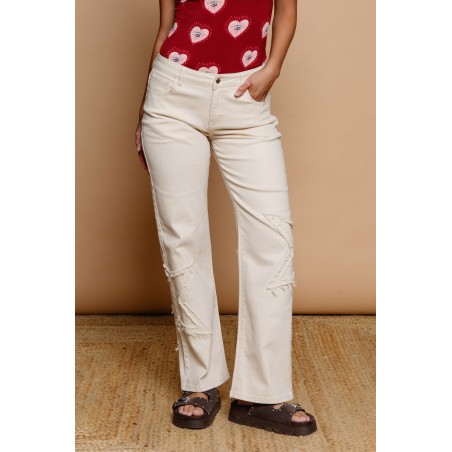 Pantalón vaquero con estrellas de parche desflecadas en laterales. Tiro medio y pernera recta. Cinco bolsillos. Tejido de algodón elástico. Cierre con botón y cremallera frontales.