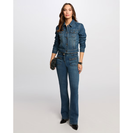 Chaqueta vaquera corta. Corte recto. Corto. Cuello de solapa. Manga larga. Cierre de botones en la parte delantera. 2 bolsillos de solapa en el pecho cierre por un botón en el pecho, 2 bolsillos con ribete en la parte delantera. Denim.