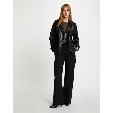 Cazadora cuero sintético corta Corte recto Cuello con muescas Manga larga Cierre de cremallera en la parte delantera Trabillas en la cintura Cinturón tono sobre tono con hebilla Pestañas abotonadas en los hombros y los puños