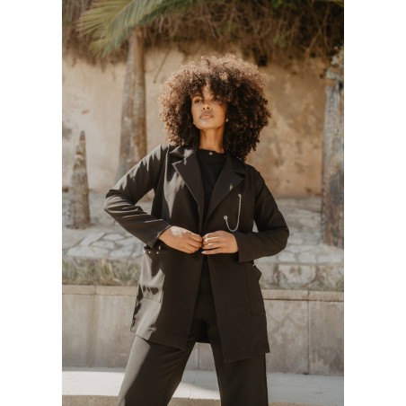 Chaqueta oversize, con bolsillos decorados con tachuelas. Adorno de cadena en el delantero. Lleva una calavera de terciopelo con detalles de encaje bordada en la espalda.