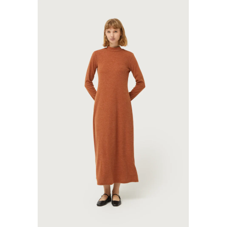 Vestido largo de punto de color camel. Con cuello mock y manga larga.