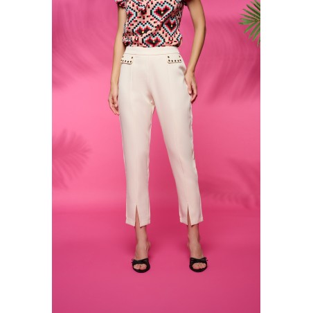 Pantalones de tiro medio con detalles de tachuelas métalicas en bolsillos de doble vivo.