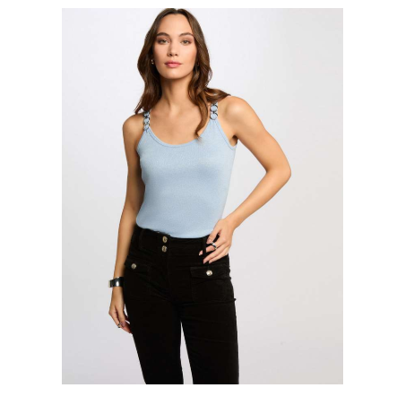 TOP CON TIRANTES FINOS, CORTE AJUSTADO, CUELLO REDONDO, TIRANTES FINOS, ADORNOS DE METAL EN LOS TIRANTES, DETALLES CON HILOS METALIZADOS