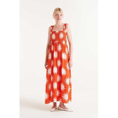 Vestido largo con estampado Big Sun. Con escote recto y tirantes con volantes. Detalle de nido de abeja en la parte superior.
