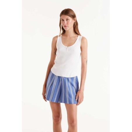 Top punto fino de color blanco. Con cuello redondo y sin mangas. Detalle de botones en el pecho.