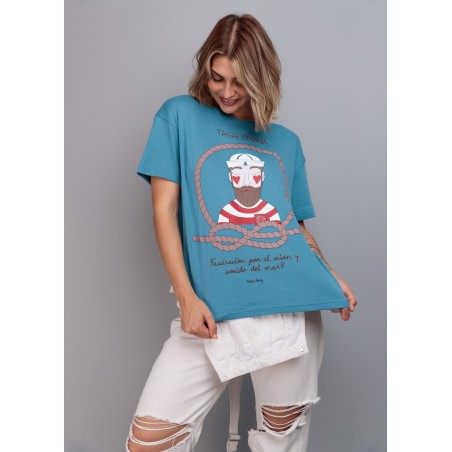 . Color de camiseta azul con ilustración de chico marinero en tonos marrones ,rojos y blancos.