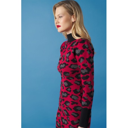 Vestido de punto elástico con estampado animal print. Cuello, puños y bajo en rib.