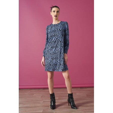 Vestido elástico de cuello barca y manga larga. Cremallera trasera oculta en costura. Forro interior elástico.
