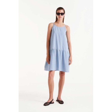 Vestido corto en tejido chambray efecto denim de color azul. Con escote recto y tirantes finos. Modelo con corte horizontal. Cierre trasero con abertura y botón.