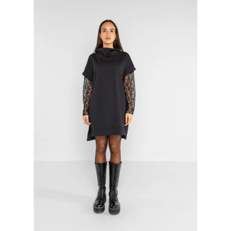 Confeccionada en suave tejido de sudadera negra, está adornada con detalles de encaje en las mangas que añaden un toque refinado y femenino.