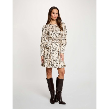 Esta vestido corta y evasé encanta por su aspecto satinado, que aporta una elegancia femenina a cada movimiento. El corte resalta sutilmente la parte superior del cuerpo, mientras que el cinturón subraya delicadamente la cintura para un efecto estructurado irresistible. Su forma fluida completa el conjunto con modernidad y ligereza.