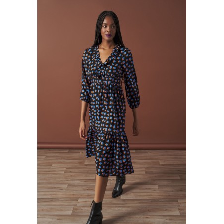 Vestido midi de escote en pico y manga larga. Ajustable con cintura elástica panal de abeja. Forro interior.